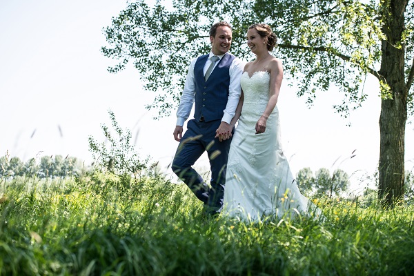 Opgetogen liep hij naar voren, langs zijn trotse dochters, haar enthousiaste ouders, lieve familie, collega´s en hun beste vrienden. De troubadour pakte zijn gitaar en we hoorden de eerste tonen van Annie´s Song, het lied dat haar herinnerde aan haar lieve oma. Deze grootmoeder, die haar ooit een waardevol geheim had toevertrouwd. Uit eigen ervaring had oma verteld hoe je de ware liefde kunt herkennen. Wat zou haar oma Annie trots zijn geweest op haar stralende, verliefde kleindochter! Haar eigenhandig gecreëerde bruidsjurk droeg ze met flair, om haar ranke lijf gegoten. Een krans van veldbloemen drukte op de glanzende krulharen, die bijna tot haar middel reikten. Haar dappere prinsje links mét het bruidsboeket, haar kleine prinses aan haar rechterhand.