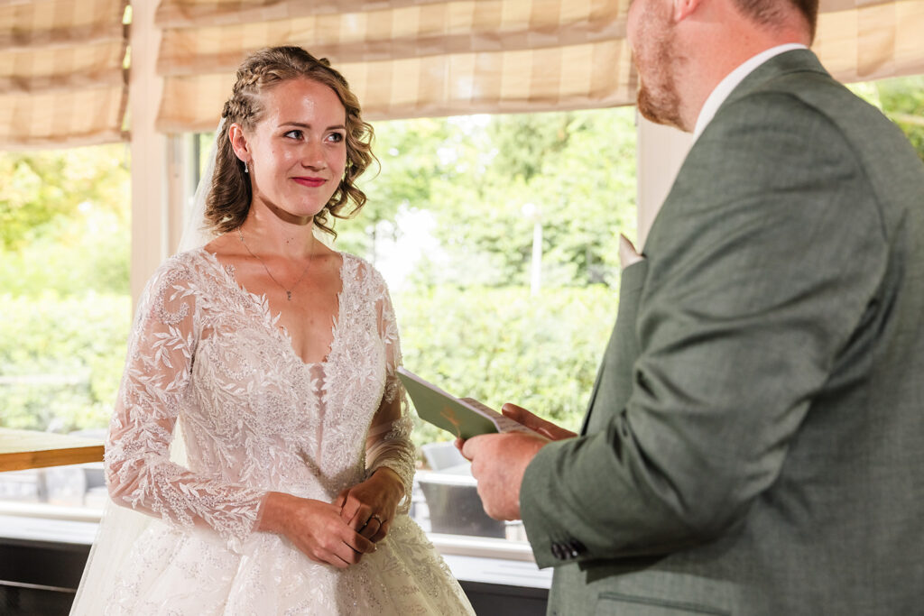 Het hoogtepunt van de ceremonie was het moment waarop zij hun liefdesverklaringen voorlazen uit hun VOW-boekjes. De bruid beet het spits af met haar liefdevolle herinneringen, grappige toespelingen en perfect geformuleerde beloften. Zoals we vooraf hadden besproken, eindigde haar betoog met dé vraag; ‘Lieve J, wil jij voor altijd mijn wederhelft zijn?’ Hij stond al te poppelen om eindelijk zijn ja-woord te mogen geven, dus dat klonk heel enthousiast. Het voornemen om elkaar pas te kussen nadat ze beiden hun JA hadden uitgesproken, werd uiteraard meteen overboord gegooid, want er volgde een innige zoen waarmee hij zijn belofte bezegelde.